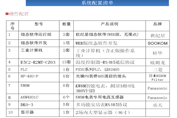 系統(tǒng)說明 l1.RS485總線來采集設(shè)備的各種參數(shù)。通過PLC與設(shè)備上的溫控表、PH值表、傳感器等以通信、 l2.使用工控組態(tài)軟件來存儲記錄PLC中采集的各種設(shè)備參數(shù)。 l3.使用KW8M 采集電流、電壓數(shù)據(jù)通過RS485通信。 l4.世紀(jì)星監(jiān)控系統(tǒng)控制策略的創(chuàng)建是在策略編輯器中實(shí)現(xiàn)的,策略編輯器是一個(gè)基于圖標(biāo),即功能模塊的設(shè)計(jì)環(huán)境.結(jié)合策略工具箱中的功能模塊及其相應(yīng)的參數(shù)配置對話框開發(fā)策略與配置工作.通過RS485總線通信采集數(shù)據(jù)連接功能塊。功能模塊也稱為軟儀表,其功能與人們熟悉的模擬儀表相同,能完成現(xiàn)場數(shù)據(jù)的采集、處理、顯示、報(bào)警和控制等(如溫度、電流、電壓、PH值、I/O狀態(tài)).構(gòu)建控制策略時(shí),用連線將策略所需的功能模塊連接起來. l5.采集的記錄報(bào)表數(shù)據(jù)發(fā)送到局域網(wǎng)外遠(yuǎn)端,在遠(yuǎn)端也能進(jìn)行數(shù)據(jù)分析。