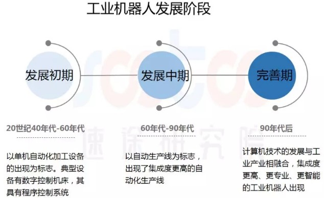 20世紀40年代到60年代是工業(yè)機器人發(fā)展的初期,以單機自動化加工設備的出現(xiàn)為標志,典型的設備為1952年麻省理工研制的數(shù)字控制機床,其具有程序控制系統(tǒng)。相比于傳統(tǒng)手工業(yè),自動化加工設備的優(yōu)勢更加明顯,更加能適應批量化生產(chǎn)的需要,并逐漸取代了人工的位置。