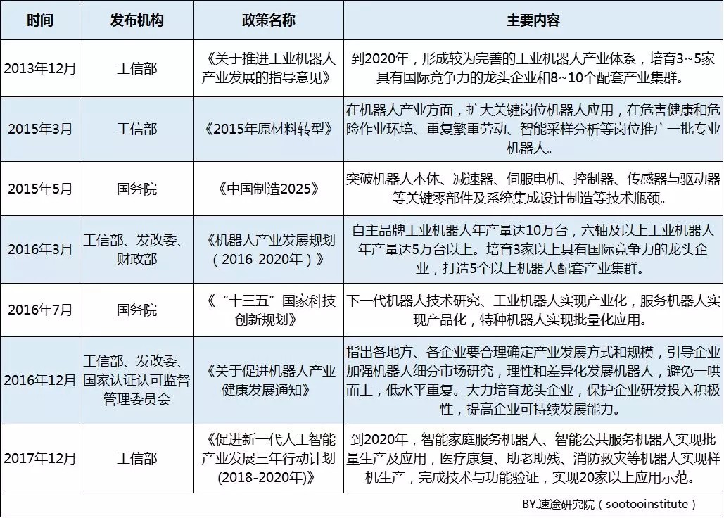 我國工業(yè)機器人市場的快速發(fā)展,離不開國家政策的大力支持。2015年5月,《中國制造2025》文件里提到,要突破機器人本體、減速器、伺服電機、控制器、傳感器和驅動器等關鍵零部件及系統(tǒng)集成設計制造等技術瓶頸。2016年3月,工信部、發(fā)改委、財政部三部門聯(lián)合印發(fā)《機器人產(chǎn)業(yè)發(fā)展規(guī)劃(2016-2020)》,文件提到自主品牌工業(yè)機器人要年產(chǎn)10萬臺以上,六軸及以上工業(yè)機器人年產(chǎn)量達5萬臺以上,并打造5個以上機器人產(chǎn)業(yè)集群。